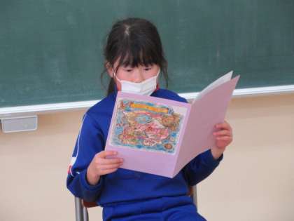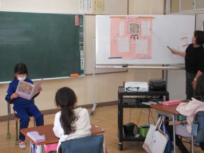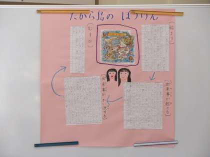 二つ目は、『たから島のぼうけん』のお話です。教科書の図を見て想像したことをもとに、物語を考えました。二人の登場人物がふとしたことから迷い込んだ宝島で、様々な困難に立ち向かい、乗り越えていく痛快な内容でした。3年生の横には宝島マップが貼られ、3年生がどの場面を読んでいるかが分かるように先生が指し示してくれました。