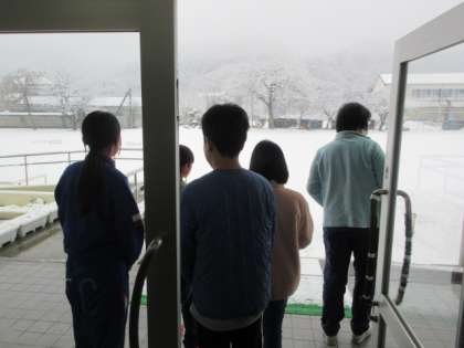 校庭にこんこんと雪が降り積もり、一面、真っ白になりました。見渡す山々もすっかり雪景色です。