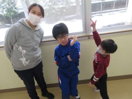 廊下では、1年生と4年生が担任の先生と一緒に降りしきる雪を眺めています。久しぶりの雪だね、家に帰ったら何をして遊ぼうかなど、楽しそうな会話が聞こえてきました。