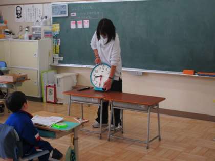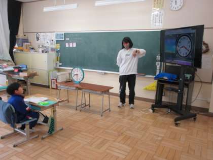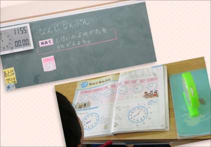 2月6日(火) 1年生算数の授業 公開日 2024/02/06 更新日 2024/02/06 できごと 1年生は、時計の読み方を学習しています。今日の授業では、画面上の時計や卓上の大きな時計を使いながら、何時何分かを考えました。なぜそう思ったかなどについて、1年生は自分の言葉できちんと伝わる言い方で説明することができました。この学習の積み重ねにより、長い針がいくつになったら…の段階から何時何分という言い方が少しずつできるようになっていきます。