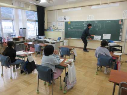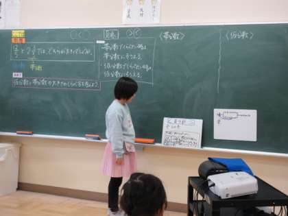 2月6日(火) 4年生算数の授業 公開日 2024/02/06 更新日 2024/02/06 できごと 今日の授業では、仮分数と帯分数の大きさ比べの仕方について考えました。4年生は自分の考えをホワイトボードに書き、皆の前で説明します。説明しながらも考えて、より良い説明にしていく姿が見られました。そうすることで、説明を聞く友達にも分かりやすく伝わり、似ている考え方だな、少し違うけどいいなと思い、自分の考えに取り入れることができます。学び合う様子がうかがえました。