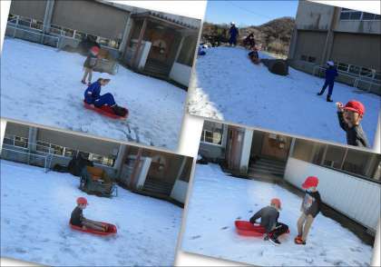 2月8日(木) 残雪で雪遊び 公開日 2024/02/08 更新日 2024/02/08 できごと 体育館北側の山の残雪で、今日も子どもたちはそり滑りや雪投げを楽しみました。雪の表面の固さが増し、雪遊びもまもなく終了というところです。ドッジボールなどの慣れ親しんだ遊びに夢中になる日も近いことと思います。