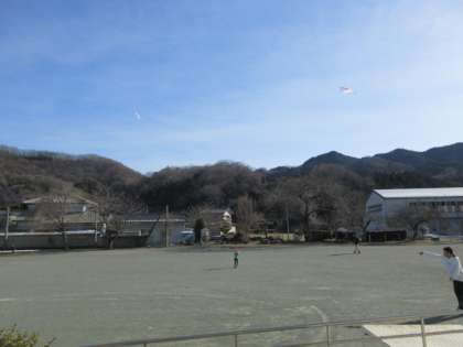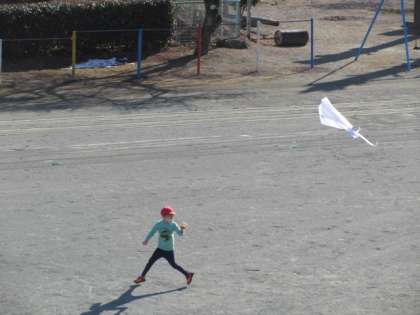 2階の3・4年生の教室の窓の外に何か白い物が浮いているのが見えたので様子を見れば、1年生が楽しそうに凧揚げしているのが見えました。5・6年生の教室の窓からも1年生を見守る姿があります。1年生の凧揚げを皆で微笑ましく思い、見守りました。