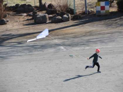 1年生は、生活科の学習の中で凧作りに挑戦しました。和紙には、自分の好きな絵が描かれています。とてもよく飛ぶ凧だそうで、今日のような微風でも、子どもたちが少し走り出すと風にたなびきました。先生たちや業務員さんたちのアドバイスを受け、糸を少しずつ長くしていくと、どんどん上へ上へと上がっていきます。
