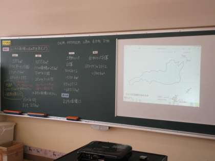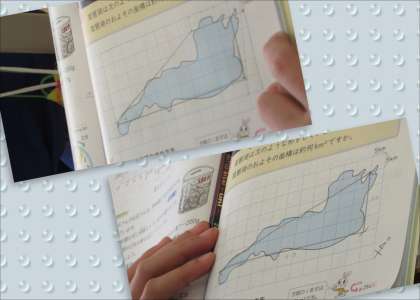 今日の授業では、およその面積の求め方を考えました。琵琶湖を例に、まずはマス目が何個分あるかを数えて面積を求めました。琵琶湖にすっぽりとかかるマス目もあれば、そうではないマス目もあり、数えたり融通したりするのは一苦労です。そこで、既習の図形を利用できないかということで、それぞれ三直角三角形や台形と捉えて公式に当てはめて面積を求めていました。計算した結果にずれがあることから、二人で話し合い、マス目の様子から三角形の高さを1マス分高くして計算し直した結果、二人のおよその面積がほぼ合いました。実際の面積にもとても近づきました。より簡単におよその面積を求める方法に、納得がいっようです。