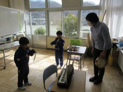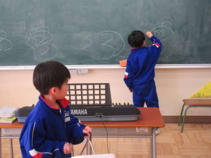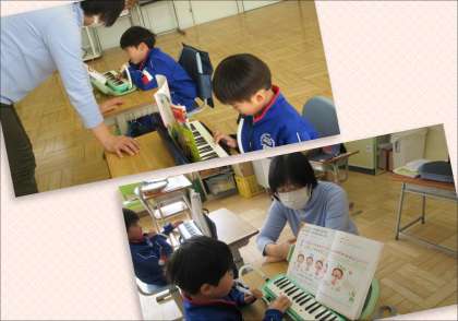 1年生は、様々な楽器の練習をしています。まずは、鍵盤ハーモニカで「とんくるりん ぱんくるりん」を弾く練習をしました。鍵盤のドレミの位置を覚え、中指、薬指、小指を駆使して弾けるよう頑張りました。続いては、「とんくるりん〜」をタンバリンやトライアングルで練習しました。先生のタンバリンと1年生のトライアングルで、担当する場所を変えていますが、拍をしっかりと取って自分の担当箇所を上手に演奏することができました。その後には、三ちゃんのお絵かき歌の音楽に乗り、一人は黒板に絵を上手に書き、一人は音楽に合わせてトライアングルをたたくなど、とても楽しく活動していました。