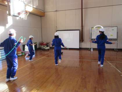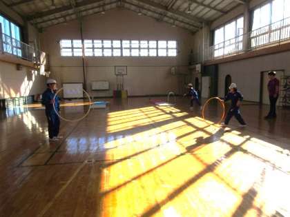 5・6年生は、バレーボール(ソフトバレーボール)に取り組んでいます。写真は、授業のはじめのウオーミングアップの様子です。「ポップコーン」という曲に合わせ、短縄で様々な跳び方を練習しています。多様な跳び方を、最後までリズミカルに正確に跳び続けるのは難しそうですが、5年生も6年生も時々止まる程度で、ほとんどの跳び方をクリアしていました。続いては、フラフープを使って相手とパスし合う活動をしました。子どもたちのやる気は、ウオーミングアップを通してぐんぐん高まっていきました。