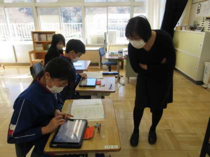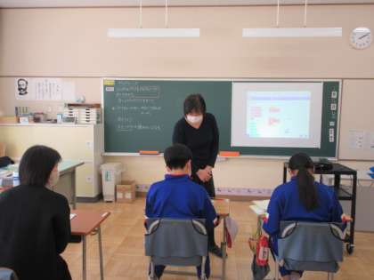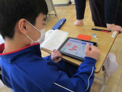 今日の授業では、比例のグラフをプログラミングでかくことに挑戦しました。y=2×xのグラフをかくにあたり、どのようにプログラムを組み立てるかを考えました。点を打つこと、点を増やすことなどが考えられ、次第にどのような指令を出せばよいかが明らかになって、児童で比例のグラフをかくことに成功しました。さらにもう一問というところでは、少々考え込む場面もありましたが、考えるそのこと自体もプログラミングということで、興味深い学習ができました。6年生は、いつものように真剣に取り組み、話し合いながら解決に向かう姿をお家の方に見ていただくことができました。