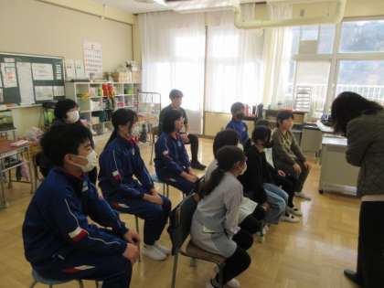 4・5・6年生には、『月のふしぎ』『キーウの月』を読み聞かせてくださいました。『月の〜』の導入では、日本の月面探査機スリムに関する新聞記事を紹介してくださいました。日ごとに変わる月の形とカレンダーの関係、国によって月の模様の呼び名がそれぞれであることなど、未知の部分が大きい月への関心が高まり、いつかは月へ…と憧れを抱くような読み聞かせでした。『キーウの〜』という詩をもとにウクライナ支援のために出された絵本です。ボランティアさんからは、いつも子どもたちが何かに関心をもち、考えるきっかけをいただいています。