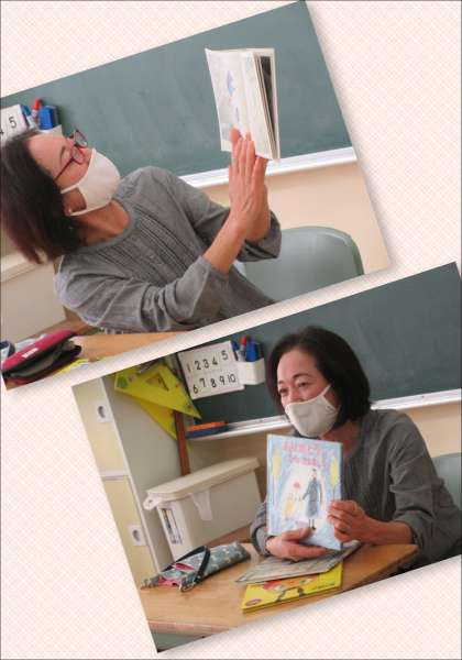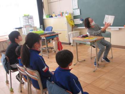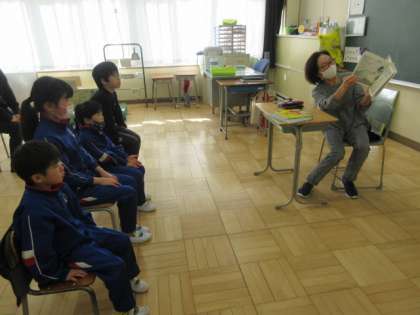 1・3・4年生には『つきよの3びき』『ホタルのアダムとほしぞらパーティー』『ありがとう…どういたしまして』を読み聞かせてくださいました。『つきよ〜』は、期せずして上学年と月つながりになりました。親に叱られてムシャクシャしても、月が明るく照らす頃にはやっぱり家がいいな、と家路を急ぐ登場人物たち。子どもたちもその気持ちがよく分かるのではないでしょうか。『ありがとう〜』は、ありがとうを伝え合うことで誰もがいい気持ちになることが伝わってきました。最後に子どもたちから「ありがとうございました」、ボランティアさんから「どういたしまして」の言葉のやりとりがあり、子どもたちも笑顔になりました。