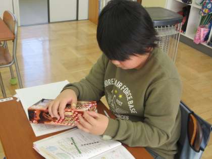 2月20日(火) 4年生算数の授業 公開日 2024/02/20 更新日 2024/02/20 できごと 今日の授業では、家から持ってきた様々な箱を活用し、直方体と立方体の頂点・辺・面の数を調べました。数えたところにはシールを貼って、正確に数えられるようにしています。子どもたちは、持ってきた箱自体がお気に入りだそうで、数調べに夢中で取り組んでいました。今後は、辺や面のつながりや位置関係などを調べ、直方体や立方体の特徴の理解を深めていきます。