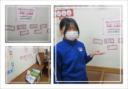 図書委員の子どもたちが、楽しい企画を考えてくれました。かわいらしい袋の中には、図書委員と先生方のお薦め本が入っています。“おもしろい本ですよ”“ファンタジー好きなあなたへ”などと記されたカードが壁に掲示され、子どもたちは、どんな本だろうとわくわくしながら福袋を選んでいます。友達と重なった時には、譲り合ったりじゃんけんしたりして借りる本を決めています。開けてびっくりの、楽しい本の福袋。とても良い企画です。