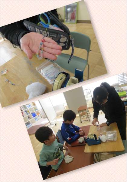 1年生と4年生は、ペットボトルを使って楽しい飾り物作りに挑戦しました。ペットボトルを2センチメートル四方に切り、ペンで模様を描いて200度のオーブンで加熱したとのことで、四角いペットがくるりと巻かれてビーズ状に。なるほど、これがペットボトルビーズなのですね。子どもたちは先生から受け取ったゴム状の細いひもにビーズを10粒通し、留め具の丸い飾り物と吊り下げ用の金具を取り付けて、それは素敵なストラップを仕上げました。環境のことを考えながら、身に付けて嬉しい飾り物ができ、子どもたちは嬉しそうでした。
