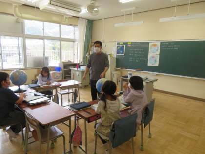 5年生の社会は「世界の中の日本」について学習しています。今日は地球儀を使い、世界や世界の中の日本の様子について調べてしました。