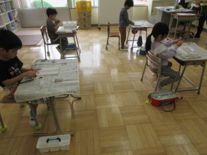 今日の1校時、1・2年生は図工の学習で、絵の具のセットを準備して、色遊びをしています。1年生は、初めての絵の具セットに興味津々のようです。