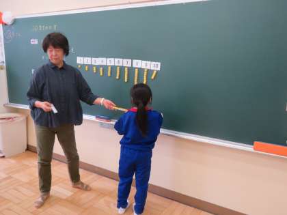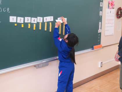 4/19 1年生算数の授業 公開日 2024/04/19 更新日 2024/04/19 できごと 1年生の算数では10までの数の学習をしています。今日は1〜10のカードの下にブロックを並べたり、カードを順番に並び替えたりする学習をしました。とてもスムーズにできました。