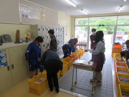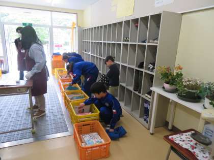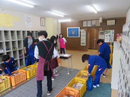5/9 学校巡回文庫 公開日 2024/05/09 更新日 2024/05/09 できごと 今日は子どもたちが楽しみにしている月一回の学校巡回文庫の日でした。小雨が降っていたため、玄関内で行いましたが、みんな熱心に本を探していました。