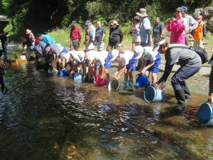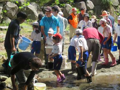 5/17 稚鮎の放流(2) 公開日 2024/05/17 更新日 2024/05/17 できごと 最初の放流は学校の近くの鮎川で行いました。歩いて鮎川まで行き稚鮎を放流しました。鮎の順調な成長を願い、みんなで一斉に放流しました。