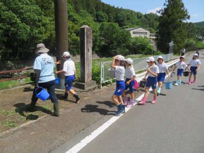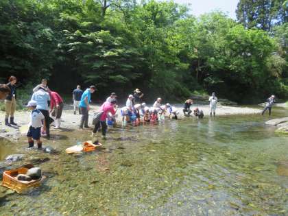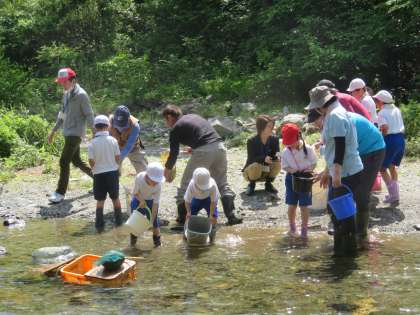 2回目の放流は旧日野中央小付近の鮎川で行いました。車で移動した後、河原に下り、みんなで放流しました。