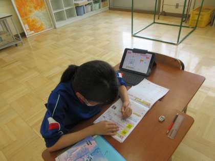 4年生は授業の最初の時間で国語の漢字の学習に取り組んでいます。タブレットの資料をもとに書き取りに取り組んでいます。