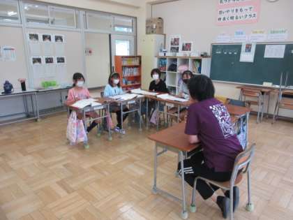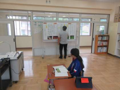 4年生と5年生はそれぞれ教室で国語の学習に取り組んでいます。4年生は先生と、5年生は先生と児童間で対話的に学習が進んでいます。それぞれ説明文を教材に、伝えたいことなどをまとめています。みかぼ学級では社会科の国土の様子の中の河川の名称を調べてプリントにまとめています。