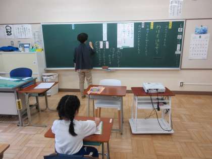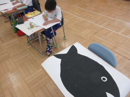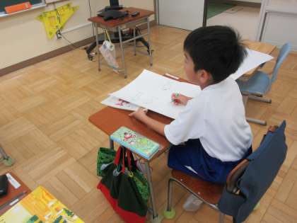 2年生は「スイミー」の物語文の学習で、今日は文中に出てくる生物を、より実感をもってとらえるため、絵に書き表しています。最後朗読劇にするときにつかうものです。どんな朗読になるのか楽しみです。