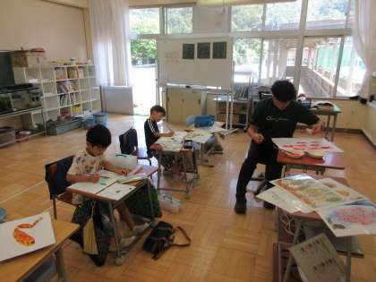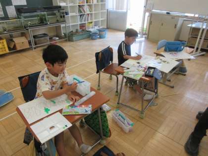 6/12 2年生国語の学習 公開日 2024/06/12 更新日 2024/06/12 できごと 2年生は国語の朗読劇「スイミー」の準備をしています。作中の生き物を絵で表しています。2人とも物語をよく読み込んでいるようで、それを絵の中に表しています。
