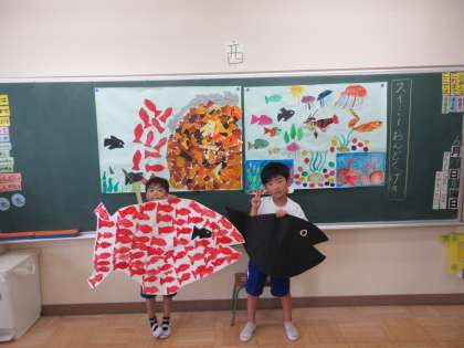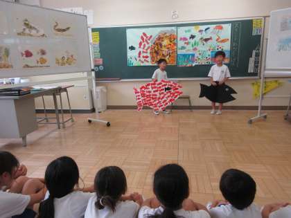 今日のステップアップの時間に、2年生が音読劇「スイミー」を全校児童の前で発表してくれました。当日に向けて何十回も練習し、イラストも一生懸命描いていました。今日の本番では、暗記したスイミーのお話を、抑揚をつけ、聞きやすい声の大きさで発表することができました。聞いていた児童からも、暗記できていてすごい、2人で揃って音読できていたのですごい、などの感想を2年生の児童に伝えていました。発表した2年生も「今日はよくできた」と満足げでした。