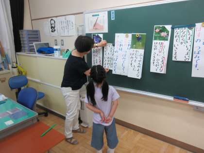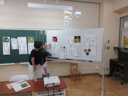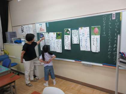 6/21 1年国語の学習 公開日 2024/06/21 更新日 2024/06/21 できごと 1年生は国語で、写真の様子と言葉での表現を合わせる活動をしています。花の様子を題材に、色や形がどのように文章表現されているかを学んでいます。「いつつにわかれる」「まるい」などの表現はすぐにわかりました。蓮の花が「さまざまなほうこうに」という表現について先生と一緒に考えています。どんどん新しい語彙が増えていきます。