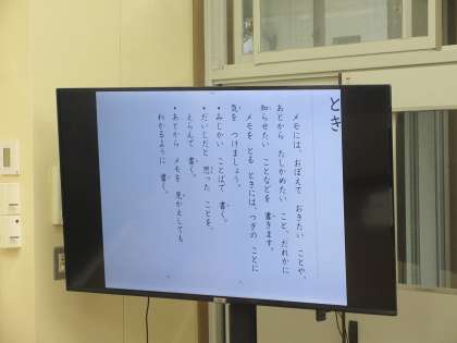 6/21 2年国語の学習 公開日 2024/06/21 更新日 2024/06/21 できごと 2年生は国語でメモをとるときどのようなことに気を付ければよいかについて学習しています。今取り組んでいる「まちたんけん」のことを思い起こし、大事なことについて考えています。今後の学習にもつながっていきます。