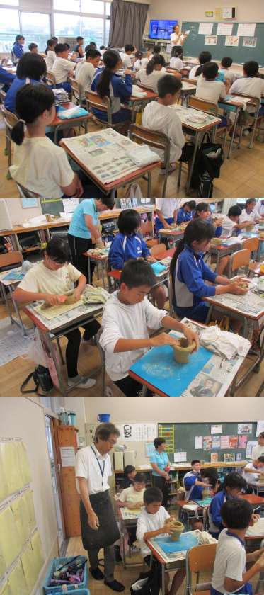 社会で、縄文時代の生活や土器についての学習をしました。今日は、平井小学校へ行き、合同で土器づくりを行いました。はじめに、土台の粘土にひも状にした粘土を重ねていき、大きな土器の形にしました。次に、竹串やフォークなどで丁寧に文様を描きました。今日の土器づくりはここまでで、2週間ほど乾燥させてから、業者の方に窯で焼いてもらう予定です。