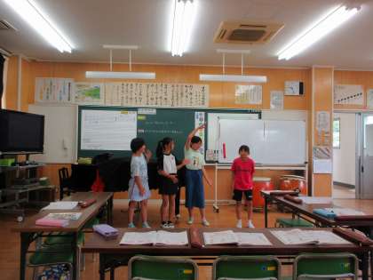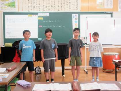 5・6年生が音楽の授業で学習したボイスアンサンブルを披露してくれました。2班に分かれて、「ラバーズコンチェルト」のメロディにあわせて、口を楽器代わりにリズムを口ずさんでいます。近くの人のリズムにつられず、上手に演奏していました。