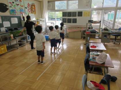 5校時は1・2年生合同で運動会の行進の練習を室内で行っています。自分たちの動きを振り返ることができるようビデオ撮影して、自分の動きを顧みながら練習しています。一生懸命がんばる子どもたちは立派だなと感心しています。