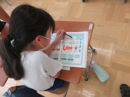 4年生は国語の学習でパンフレットの読み取りに取り組んでいます。特に読み手が読みやすいように工夫しているところを見つけて、次の「書く」活動に移る準備をしています。工夫の中で、「語りかけるような文体」に気付くところが難しかったようです。ふだん見慣れているパンフレットも、実は様々な工夫がされていることに気付くことができました。