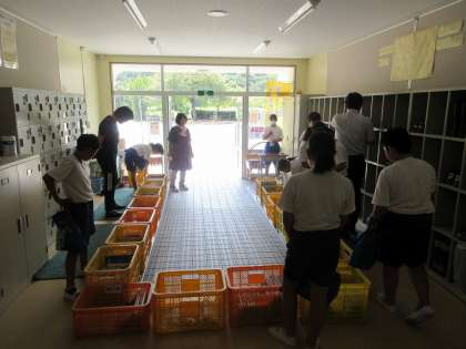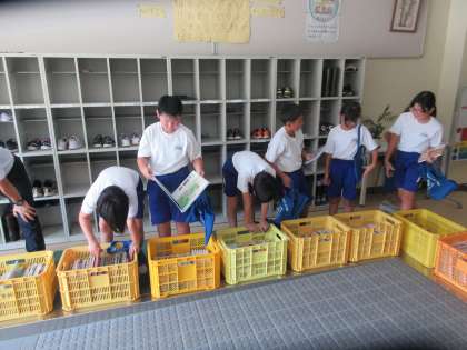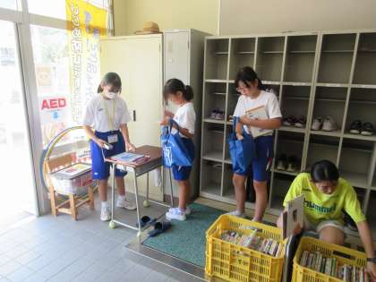 9/5 3校時学校巡回文庫 公開日 2024/09/05 更新日 2024/09/05 できごと 今日は学校巡回文庫の日です。子どもたちは気に入った本を見つけ借りています。すぐに見つかる子、散々迷っている子、先生にアドバイスをもらう子など様々です。みんな巡回文庫を楽しみにしています。今回はチャレンジウィークで職場体験を行っている中学生も来校し、貸出業務を行っています。