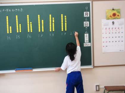 9/6 3校時1年生算数の学習 公開日 2024/09/06 更新日 2024/09/06 できごと 1年生は算数で昨日に引き続き10より大きい数の数え方を、タイルを使って学習しています。今日は20をどのように表したらよいかを先生といっしょに考えていました。20の「2」(10の位)が「10のかたまりが2個」あることに気付くことができました。また「バラの数が0個」であることにも気付きました。途中先生から魔法をかけてもらうなど、楽しく学んでいます。
