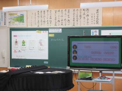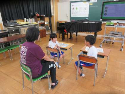 12年生は音楽で泣き声を使って楽しむ学習を行っています。カラスの鳴き声を音の高さや強さを変えて、友だちといっしょにまねたり、音程を変えて重ねたりして楽しんでいました。どのようにするかは子どもたちが考えて決めます。今日は2年生のお兄さんが中心となって考えを述べ、実践していました。