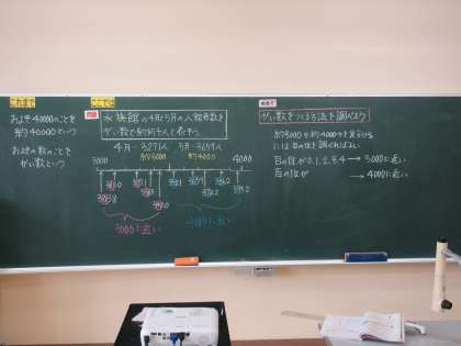 4年生は算数でおよその数について学習を進めています。今日は3000に近い数、4000に近い数について、百の位に注目しどのような規則性があるかを考えていました。3100〜3400が3000に近い数、3500〜3900が4000に近い数であることを数直線で確かめていました。この後、四捨五入の方法について学んでいきます。