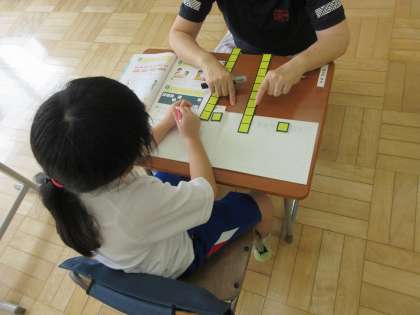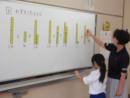 9/9 3校時1年生算数の学習 公開日 2024/09/09 更新日 2024/09/09 できごと 1年生は算数の10より大きい数の表し方を学習しています。今日は「10と7でいくつになる」「17は何と7でできている」など10のかたまりと1けたの数のかたまりで構成される数について考えていました。「10と7でいくつなる」という問いにはすんなり答えていましたが、その逆がよくわからないようなので、タイルを使って何度も先生といっしょに操作しながら考えていました。