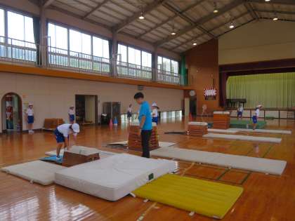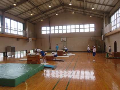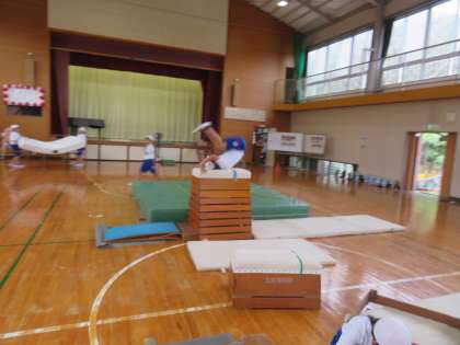 高学年の体育は跳び箱の学習をしています。今日は台上前転の練習をしていました。個々のレベルに応じた練習に取り組んでいました。