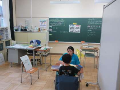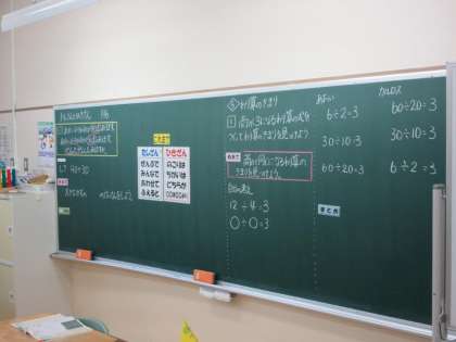みかぼ学級では算数で5年生が商が3になるわり算のきまりを見つけています。2年生は2けたの数の足し算に取り組んでいます。足し算引き算の文章題での言葉の表し方(ぜんぶで、あわせて、のこりは・・・など)を示した表を手がかりに、問題が足し算であることがわかり、大きな声で「できた」と先生に教えていました。