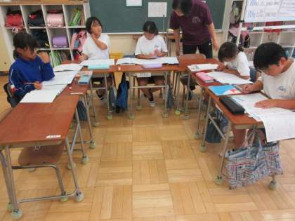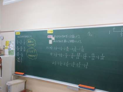 5年生は算数の帯分数の足し算引き算の学習に取り組んでいます。今日はまとめとして練習問題に取り組んでいましたが、「めあて」を一人一人が考えて、黒板に提示してありました。自分が苦手なところだったり大事だと思うところだったりしたことを確認した上で問題に取り組んでいました。