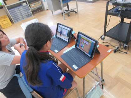 10/4 2校時4年生英語の学習 公開日 2024/10/04 更新日 2024/10/04 できごと 4年生は、ALTの先生、美土里小の専科の先生といっしょに英語の学習をしています。今日は机の上にある文房具の紹介を英語でスピーチする学習に取り組んでいました。最初は先生の発話を聞きながら復唱して、その後黒板前で発表し、それをタブレットで録画して振り返りを行っています。自分のよさに気付けていたようです。