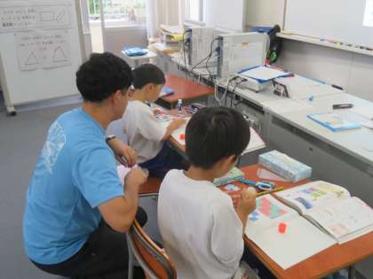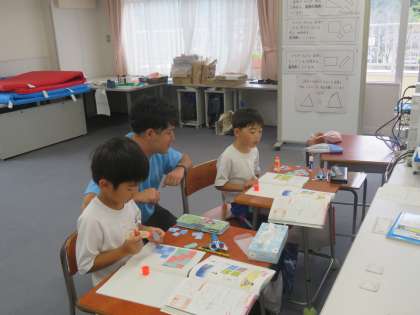 2年生の算数は「形をしらべよう」の学習で、三角形と四角形について学習を進めています。今日はこの単元の最後の学習で、四角形や三角形をしきつめて模様をつくる学習をしていました。