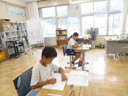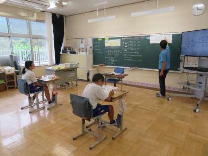 6年生の算数は分数のわり算の学習をしています。今日はわる数と商の大きさの関係について考えていました。わる数が1より小さいと商はわられる数より大きくなり、わる数が1より大きいと商はわられる数より小さくなることが分かりました。