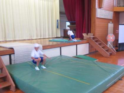 10/8 5時間目高学年体育の学習 公開日 2024/10/08 更新日 2024/10/08 できごと 高学年の体育は跳び箱の学習をしています。今日は閉脚跳びの練習として、ステージ高さを利用しての練習に取り組んでいました。