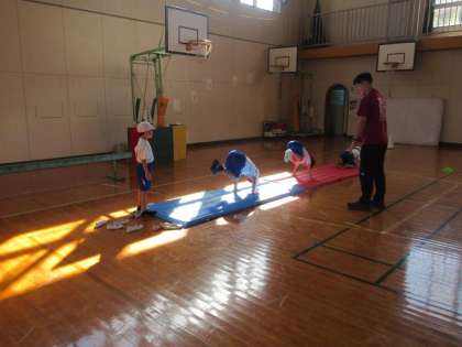 10/11 1校時12年生体育の学習 公開日 2024/10/11 更新日 2024/10/11 できごと 12年生は体育館で跳び箱運動の学習です。体つくり運動も兼ねて、マットで跳び箱に必要な動きの練習をした後、実際に跳び箱を跳んでみます。まずは開脚跳びの練習からです。跳び越せるようにがんばって練習中です。