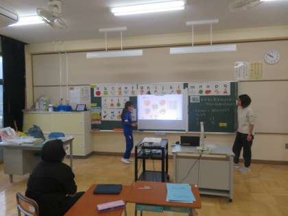4年生の今日の外国語活動は「小文字の単語クイズをしたり、アルファベットを並べたりしよう」をめあてに学習していました。英語の音声を聞き、どの言葉を表しているかを考えることができました。