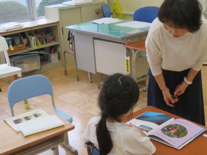 10/18 3時間目1年生国語の学習 公開日 2024/10/18 更新日 2024/10/18 できごと 1年生の国語は「うみのかくれんぼ」の学習をしています。今日は図書館の本を利用して、教科書に出ていないコバンザメのかくれかたを調べていました。