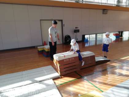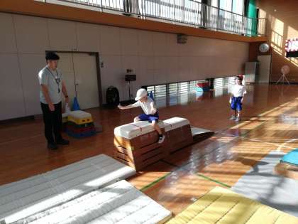 12年生は跳び箱の学習。 今日は感覚を掴むため跳び箱を2つ並べて手でかく練習をしています。